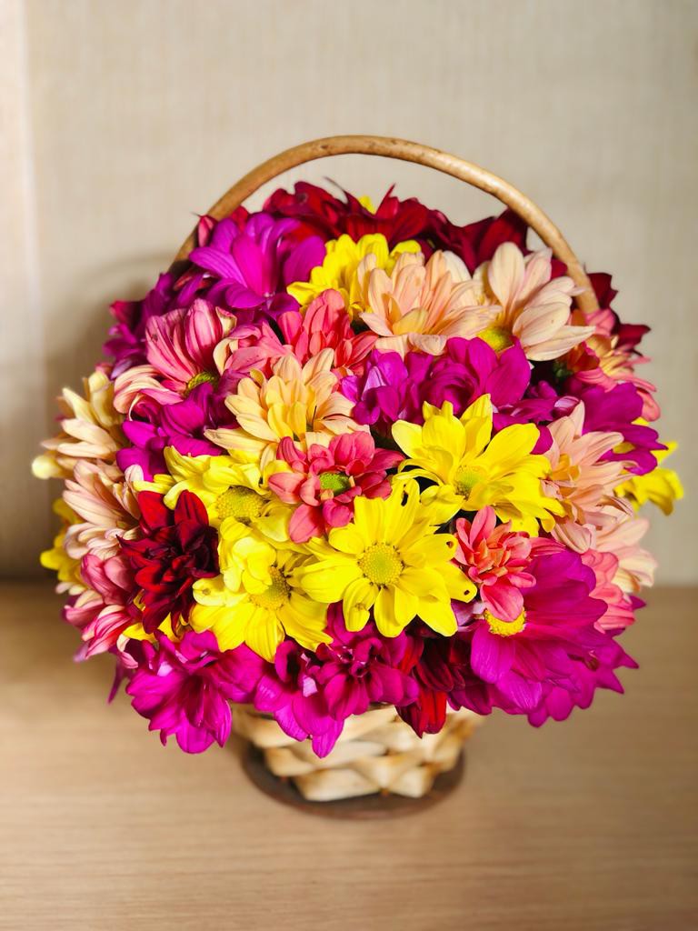 Uma linda cesta de flores do campo. Charmosa variação do buquê, que caí muito bem em comemorações e agradecimentos. Emocione quem você ama com um pouco da beleza e do frescor do campo!