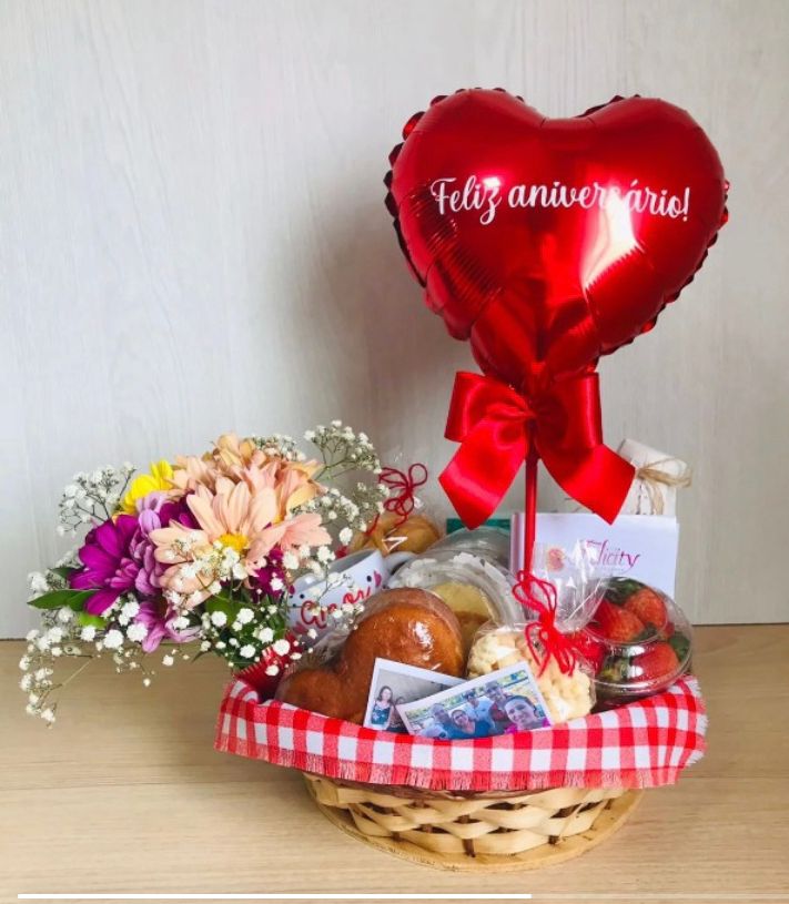 Uma cestinha recheada de delícias e carinho! Bolo, torradinhas, empadinhas e geleias se unem a mini fotos ímãs, flores do campo e um balão de foil personalizado para tornar o chá da tarde uma viagem pelas doces lembranças.
