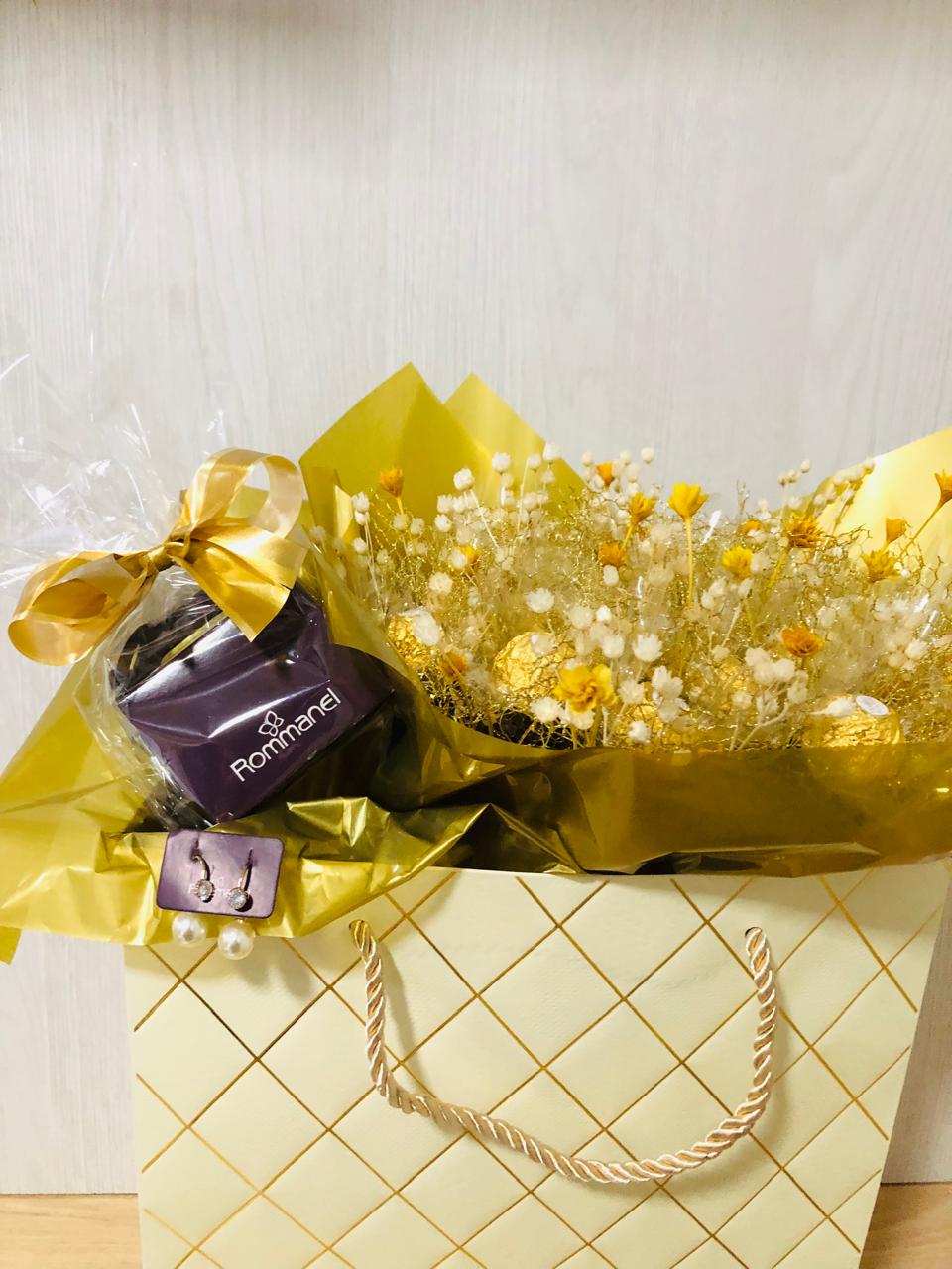 | Buquê de Flores Permanentes e Chocolates Italiano | 1 Unidade |