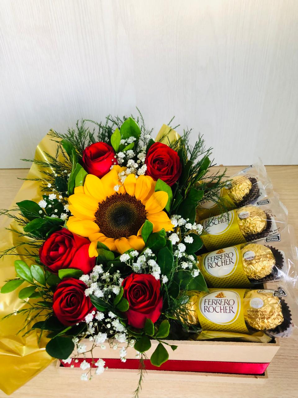 Nossa caixa de rosas vermelhas combinam muito com os chocolates italiano ferrero rocher, uma surpresa romântica e sofisticada.