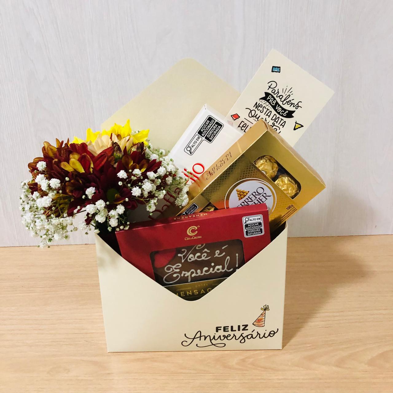 Este presente é uma escolha perfeita para surpreender com a experiência irresistível dos chocolates italanos, combinando com o sabor intenso do chocolate brasileiro e para completar, mini de flores do campo, que adiciona um toque de delicadeza ao presente. Surpresa de Aniversário é uma demonstração de afeto e bom gosto, ideal pra celebrar momentos especiais com estilo e doçura.